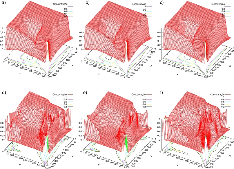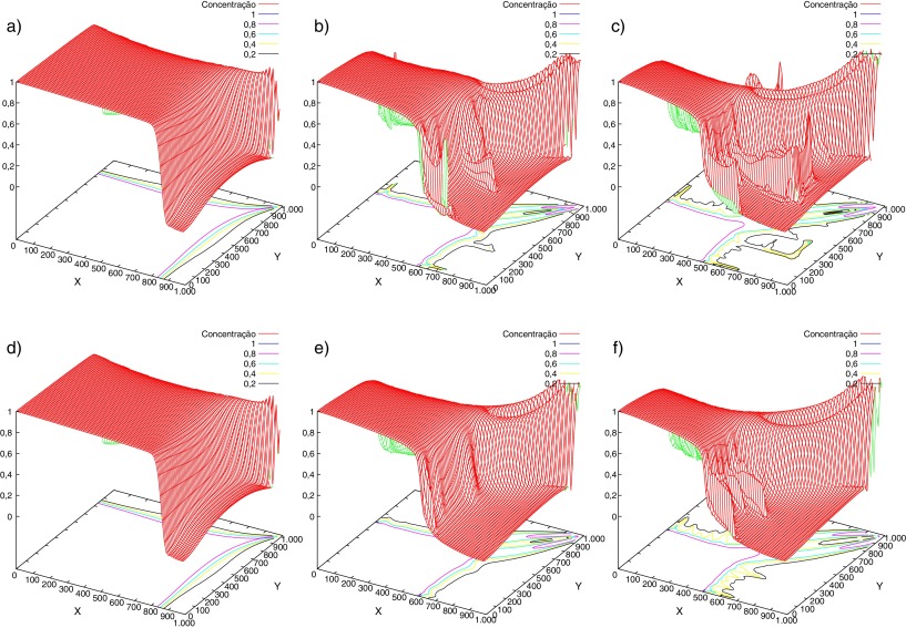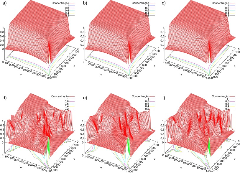 Figura 5. Mapas de concentração. Cenário 2 com M = 1 (linha superior) e M = 41 (linha inferior), variando a permeabilidade do meio com fator = 0,01;0,1 e 0,2, da esquerda para a direita. |