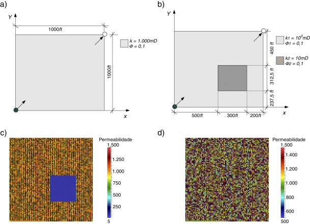 Analisamos aqui resultados das simulações numéricas referentes ao problema de injeção contínua em um meio poroso isotrópico (reservatório) com tensor de permeabilidade , onde é o tensor identidade, representado pela configuração (arranjo) de 5 poços. Por razões de simetria o domínio é definido como um quadrado de lado L = 1.000 ft , correspondendo a um quarto do arranjo, com um poço injetor e um poço produtor alinhados na diagonal principal [6] , como ilustrado na figura 1 (a), denotado por Cenário homogêneo , com permeabilidade constante k = 103mD e porosidade ϕ1 = 0, 1. Além disso, consideramos um Cenário heterogêneo com 2 regiões de permeabilidades distintas, k1 = 103mD (cor clara) e k2 = 10 mD (cor escura), ver figura 1 (b). A partir desses 2 cenários geramos os cenários 1 e 2 onde o campo de permeabilidades varia de elemento para elemento, de forma aleatória, de acordo com a seguinte equação:
