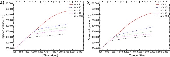 Figura 3. Curvas de produção variando a razão de mobilidade (M ). (a) Cenário homogêneo e (b) cenário heterogêneo. |