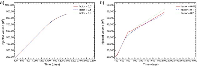 Finalmente, visando ilustrar o efeito da permeabilidade do meio na recuperação do reservatório são exibidos nas figuras 4 e 5 mapas da concentração para os cenários 1 e 2, tomando M = 1 e M = 41. Para M = 1 (linhas superiores nos 2 cenários) a variação na permeabilidade leva a uma alteração imperceptível no transporte entre os 2 poços, como pode ser observado nas curvas de produção plotadas na figura 6 (a), referentes ao cenário 1. Porém, quando se considera uma razão de mobilidade adversa (M = 41) a recuperação fica bastante afetada, como pode ser observado nos resultados exibidos (linhas inferiores nos 2 cenários) e, ainda mais evidente, através das curvas mostradas na figura 6 (b), onde, comparando-se com M = 1, é possível observar a queda na recuperação do volume injetado.
