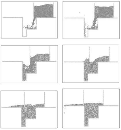 Fig. 15 shows an example of application of the PFEM to the mixing of a collection of particles within a container filled with a fluid of a higher density. Initially the particles are thrown into the container and mix within the fluid as shown. As time evolves the particles move up towards the surface of the fluid due to their lower density.
