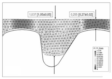 Fig. 8 shows a detail of the deformed shape with finite element discretization and the distribution of effective plastic strain. The obtained dimensions are compared with the required ones shown in brackets. Effects of elastic springback can be clearly seen.