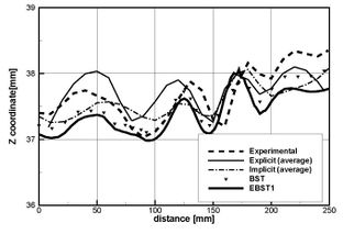Figure 10. Stamping of a S-rail. (a) Punch force versus punch travel. (b) Z-coordinate along line B´´-G´´ after springback. Average of explicit and implicit results reported in NUMISHEET'96 (1996) are also shown.