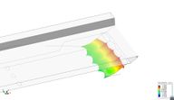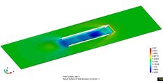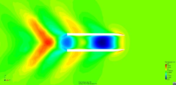 In the following sequences, the deformed bow and stern seals, wave pattern and cushion free surface deformation are shown. The results show how the bow seals create an unstable free surface deformation pattern in the cushion area, while the stern seal is deformed until it is adapted to a configuration in which it almost slides on the water.
