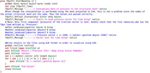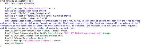 In the Exhibit 1 the TCL script is shown along with the documenting comments. As an indication, we shall explain that 2 auxiliary meshes are used in this interpolation process. This is because the meshes of the structure and the coupling free surface are not coincident in geometry. That is, the mesh of the free surface lies at the flat free surface of the water. This is natural given the solving strategy for the fluid. Likewise, the mesh of the structure lies outside of the flat free surface of the water, as the seals are designed to seal the air cushion above the water.