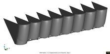 The following pictures show the boundary conditions using in the structural model, for the bow seals. These include fixed constraints in upper part and non-linear elastic constraints in the sides of the seals. The later simulate the mechanic contacts of neighbouring fingers.
