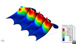 The loads on the membrane are of two types. First, let’s consider the loads imposed by the air cushion system. The air cushion system acts differently on the bow skirt and the stern seal. On the bow skirt, the air cushion applies a direct follower load on the inner side of the skirt. On the stern seal, a differential pressure between the inside of the lobes and the air cushion maintains the seals taut. All these loads are considered as follower loads. A follower load has the property of not maintaining the symmetry of the system matrix for the implicit solver. Therefore, we need to choose an adequate numerical solver for the system of equations.