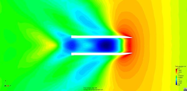 In this section, the towing test of the craft is analysed, including flexible fingers (bow seals). Three velocities are run, Froude numbers 0.4, 0.8 and 1.2.