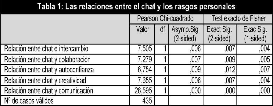 Así, la tabla 1 muestra que existe una relación significativa entre el chat y el intercambio en un nivel de 5% (sig=,006). Estos datos evidencian que los estudiantes son más propensos a desarrollar su intercambio a través del chat de una manera interactiva. En cuanto a los requisitos de la tarea cuyas líneas fueron especificadas por sus profesores, los estudiantes debían comunicarse con sus amigos con el fin de intercambiar información valiosa mientras completaban sus tareas. Se trataría de una conversación preplaneada. Las herramientas de chat en línea pueden servir como un activo valioso para las tareas de colaboración. En ese sentido, ya que la tarea es a menudo considerada como una tarea individual, los resultados de los datos indicados anteriormente refutan la noción clásica sobre que la tarea en casa es una tarea de una sola persona.