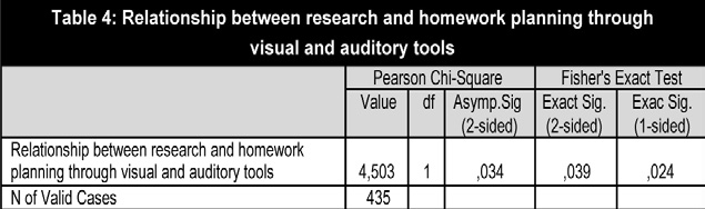 Table 4 shows that there is a significant relationship between using multimedia for conducting research and homework at the 5% level. Those who use multimedia tools for research can plan their homework better through digital organizers such as word-processor, paint brush, PowerPoint etc. It should not be forgotten that planning is an essential part of research and exploration, as is homework.