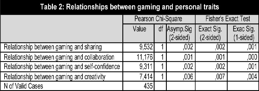 As for the relationship between gaming and personal traits such as sharing, collaboration, self-confidence, and creativity, table 2 provides the related significance levels.