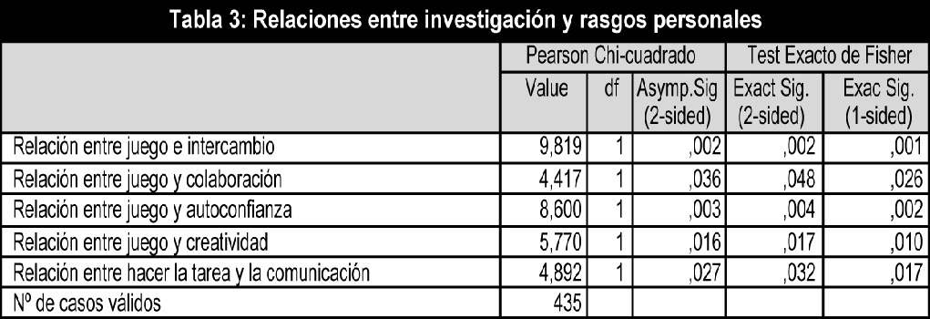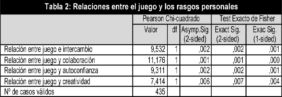 En cuanto a la relación entre el juego y los rasgos personales tales como el intercambio, la colaboración, la autoconfianza y la creatividad, la tabla 2 ofrece niveles significativos al respecto.