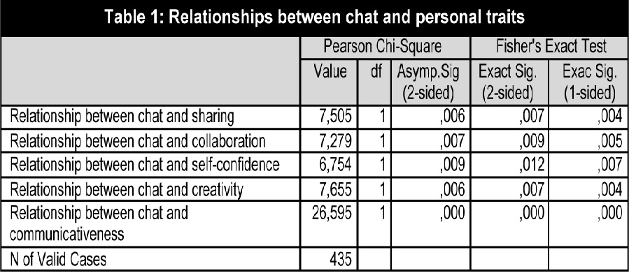 As for chat and collaboration, data from table 1 shows that there is significance at 5% level (sig=,007), which can be interpreted as «students tend to collaborate more during chat as they are more likely to be prepared and relaxed».