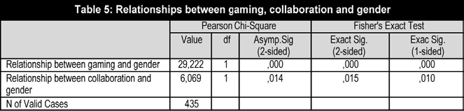 In that sense, it is noticeable that there is a significant relationship between gaming and sharing at 5% level (sig=,002).This means while doing their homework online, students find it as enjoyable and as entertaining as playing games.