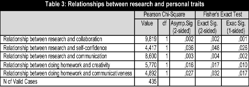 As students use the internet, they happen to find more opportunities for self-realization, which reinforces self-confidence as well. The relationship for this was found significant at 5% level (sig=,002). Data for the relationship between gaming and creativity (sig=,006) show that as most games include various interactive tools that require development strategies, students’ creativity is promoted significantly. A digital game can often be as challenging, time consuming and procedural as homework itself. It is a well-known fact that homework assignments include various tasks that often require research. For that reason, to better understand the relationship between research and personal traits (collaboration, self-confidence and communication), table 3 provides the related significance levels.