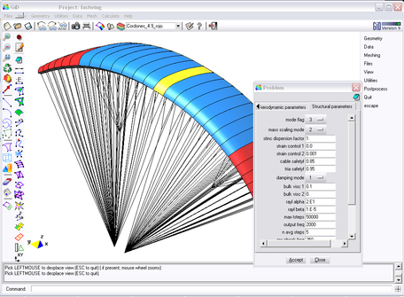 The use of the parachute simulation code is facilitated by a graphical user interface2 (GUI) developed on the basis of the GiD system [8], an in-house software providing fully integrated tools for geometry and input data definition, code execution and post-processing of the analysis results. The GiD pre-process module allows generating all the input data for the simulation. Complex CAD geometries can be created and manipulated in a simple and efficient manner and models can be also imported on IGES, DXF and many other typical formats. The application of boundary conditions and the definition of the simulation parameters can be easily carried out through a series of customized menus which also allow verifying the conditions prescribed on the model. A view of the user interface in pre-process mode is displayed in Figure 7. In addition, GiD includes all the necessary tools for generating structured and non-structured meshes in complex geometries. After creating the mesh, all the code input files are automatically generated by specific customized templates. Then, the simulation can be started and the evolution of the process followed into the GiD enviroment. As soon as results are available, these can be visualized by switching to the GiD post-process module. This tool offers a wide range of possibilities, not only for visualization purposes but also for results data extraction including text and binary files, user-defined plots, images and video animations showing the simulation evolution in time.