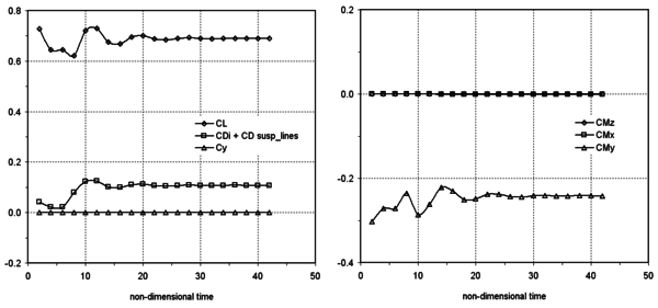 The time history of force and moment coefficients is displayed in Figure 9, where the moment coefficients are computed about a point located between the suspension line’s confluence points. Note that the transient behaviour lacks a physical meaning as under-relaxation has been employed to accelerate the problem convergence to the steady state solution.