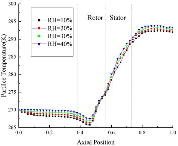 The change of ice crystal temperature under different RH is shown in Figure 2(a). Comparing the results of Case A14, A24, A34 and A44, it could be found that the particle temperature at the same axial position is positively correlated with RH. This is because the evaporation and sublimation effects of ice crystals decrease with the increase of RH. At the inlet of rotor area, the particle temperature of Case A14 is 0.9 K lower than the initial temperature. While in the stator area, the ice crystal temperature exceeds the ice crystal melting temperature (273.15 K). And at the outlet of compressor, the particle temperature of Case A44 is 1.4 K higher than that of Case A14.