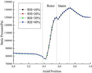 The temperature distribution of the internal flow field is shown in Figure 3(a). In the front area of the compressor, the flow field temperature curves under different RH coincide basically. At the inlet of the rotor area, the flow field temperature of Case B44 is 0.9 K higher than that of Case B14. Besides, in the rotor area, the flow field temperature increases rapidly under the work of blades, and the influence of RH on the flow field temperature increases. Furthermore, at the outlet of the compressor, the flow field temperature of Case B44 is about 5 K higher than that of Case B14.