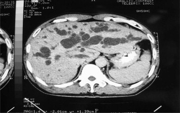 Figure 1. Computed tomography scan of the liver showed marked dilated bilateral intrahepatic bile duct in type 4 hilar cholangiocarcinoma. |