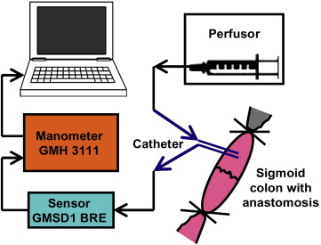 A median laparotomy was performed following standard aseptic preparation of the surgical field. A two-way 7.5 F cannula (Vygon, Ecouen, France) was inserted into the anastomosis or other procedure-free sigmoid colon via puncture incision and was watertight-fixed to the intestinal wall with two circular polyester sutures (Mersilene, 2/0 Johnson & Johnson, Division of Ethicon, Somerville, NJ, USA), then attached to the measuring device. The measuring device consisted of a digital manometer (GMH 3111) and a relative pressure sensor (GMSD 1 BRE; Greisinger Electronic, Regenstauf, Germany). These were linked through a computer. The intraluminal pressures in the colon were measured over 60 minutes. With the support of EBS 20M software (Greisinger Electronic), the recording was continuously transferred and saved to a computer.