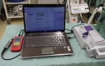 Figure 1. Measuring device consisting of a computer with software that continuously measured the intraluminal pressure, a digital manometer, a measuring gauge, and a linear liquid dispenser. |