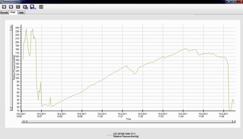 A visual revision of the anastomosis was first performed (Fig. 3). The colon was subsequently completely closed approximately 3.5 cm prior to and 3.5 cm after the anastomosis with circular ligatures. A two-way 7.5-F cannula (Vygon) was inserted into the lumen of the colon via a puncture incision. The cannula was watertight-fixed to the intestinal wall with two circular polyester sutures (Mersilene, 2/0; Johnson & Johnson). One cannula outlet was attached to a linear liquid dosing system via an infusion set, and the lumen of the intestine was gradually filled with saline solution at a rate of 300 mL/hour. The other outlet was attached to a measuring device connected to a computer with pressure-change analysis software (Fig. 4). The manometer continually measured the increasing pressure in the lumen. The measured values were continuously transferred to the computer as described for the control group. The increasing pressure in the intestinal lumen was recorded graphically as a curve and numerically in tables. The monitoring was performed up to the point when the continuity of the anastomosis was disturbed, as evidenced by leakage around the anastomosis and, at the same time, a fall in pressure visible on the graph (Fig. 5). At the end of the operation, the animals were euthanized by IV administration of T61 (Hoechst, Frankfurt-on-Main, Germany).