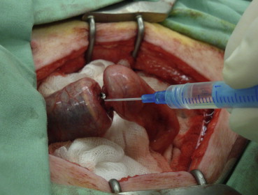 The colon was subsequently closed completely approximately 3.5 cm prior to and 3.5 cm after the anastomosis with circular ligatures, as well as peripherally from the ligatures, with intestinal staples. One cannula outlet was attached to a linear liquid-dosing system (Technic I, AMV Technics, Brno, Czech Republic) via an infusion set and the lumen of the intestine was gradually filled with saline at a rate of 300 mL/hour (Fig. 1). Measurements were repeated up to the point when the physiological solution started to leak around the cannula or the cannula loosened up. The aim of these measurements was to test the strength of the cannula fixation to ensure that the intestine around the cannula fixation was not disturbed sooner than the glued/stapled anastomosis (Table 1).