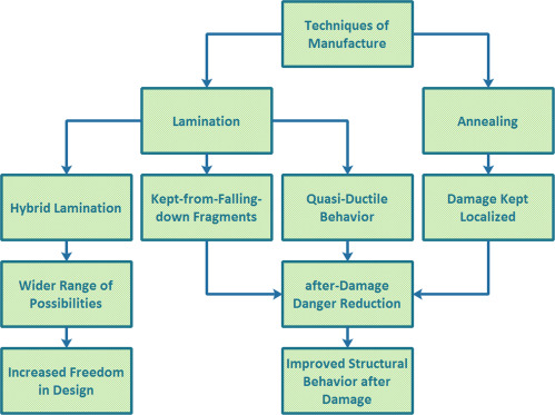 In the process of annealing, glass is cooled slowly (Chinzi, 2013 ). As a result, internal stresses, which significantly decrease the overall strength of glass, are significantly reduced (CMog, 2011 ). Furthermore, annealed glass can transfer compressive forces even after breakage because it breaks into large shards (Bos et al., 2005 and Feirabend, 2008 ). Consequently, laminated glass made of annealed glass has higher post-breakage strength (Feirabend, 2008 ). Nonetheless, annealed glass is not only sensitive to thermal shocks but also unsafe in the case of fire incidents (Veer et al., 2001b and Wilson and Vasilchenko-Malishev, 2006 ).