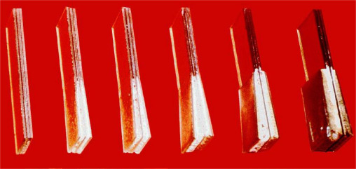 In summary, each type of glass has its own particular advantages and disadvantages. To take advantage of different positive aspects, hybrid laminates have been made, which are composed of various types of glass (Belis and Rudy Van Impe, 2005 and Chaszar, 2003 ). Using hybrid laminates, the dead load is reduced considerably (Blandini, 2003 ) (Figure 2 b), and structural performance is improved economically (Chaszar, 2003 ).