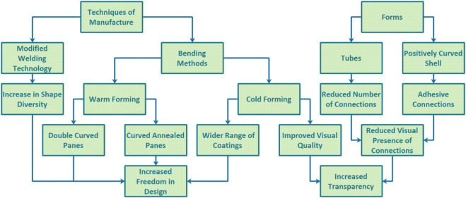 Thus, the form of structures and the bending techniques of glass affect the appearance, cost, and lifetime of glass structures. For example, the forms compatible with adhesive joints or those that decrease the number of connections lead to more transparent structures (Figure 13 ). Moreover, the fabrication cost can be reduced through the appropriate segmentation of double-curved surfaces into a plane or single-curved panels (Figure 14 ). Efficient forms can reduce the aging effect by decreasing the exposed length of interlayers or in permanent high stresses (Figure 14 ). In addition, the different techniques of forming glass offer various possibilities (Figure 13 ). However, each form or forming method also presents some constraints, which need to be considered in designs with glass. Accordingly, more efficient glass structures can be constructed when the limitations are well known and when the potential of forms is exploited.