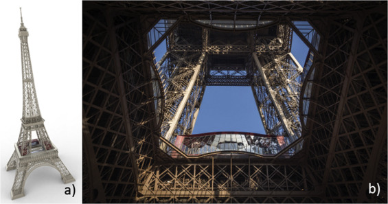 Figure 20. First floor of the Eiffel Tower (Eigensatz, 2012 ) (a) and (Press) (b): the double-curved facades of the pavilion were geometrically optimized during an integrated design process. |
