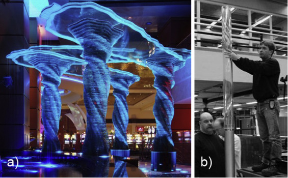 During the warm bending process, flat glass is placed on a mold and then sufficiently heated to be formed while still in its plastic state (Chinzi, 2013 and Doulkari, 2013 ). It is then allowed to cool slowly (Doulkari, 2013 ). The product of the process, called annealed glass, can also be tempered (Bon, 2003 and Doulkari, 2013 ). Single-curved panels can be tempered either thermally or chemically, although complex shapes can only be tempered chemically (Fildhuth et al., 2012 and Wurm, 2007 ). After tempering, curved panes are laminated (Bon, 2003 ). To improve the quality of the laminate, flat panes separated by fleece layers are laid over each other and bent at the same time. This method minimizes the tolerance between the panes (Kramer and Elstner, 2012 ). Moreover, when the welding technology is fine-tuned, much more complex shapes can be produced (Bos et al., 2008 ). To produce glass welds as strong as the main material, substrates must be heated evenly (Belis et al., 2011 ). At present, welded glass elements are limited to tubular shapes (Figure 9 a) because evenly heating the substrates of flat glass using current techniques is difficult (Bos et al., 2008 ) (Figure 9 b and c).