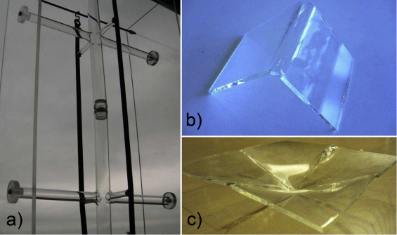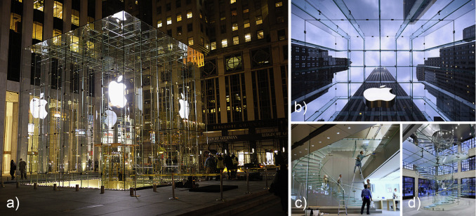 The shells of positive curvature are perfect for construction of glass structures (Aanhaanen et al., 2008 ). They minimize bending stresses (Bagger et al., 2007a ) and primarily transfer loads via membrane stresses (Aanhaanen et al., 2008 , Bagger et al., 2007 and Blandini and Arch, 2008 ). Their stiffness-to-weight ratio is also high (Figure 2 a) since they absorb loads with their overall shape instead of a local sectional area (Bagger, 2010 and Bagger et al., 2007 ). Furthermore, as a result of adhesive technology, completely transparent shell structures can now be constructed (Blandini, 2007 , Blandini and Arch, 2008 , Blandini and Sobek, 2014 and Blandini et al., 2014 ) (Figure 2 b). Adhesive joints can form glass surfaces without any optically interrupting element (Blandini, 2003 and Blandini and Arch, 2008 ). In addition, they join glass panes along their edges (Blandini, 2003 ), thereby minimizing stress concentrations.