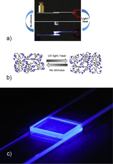 Segmented structures dampen the shock waves, thereby keeping damage localized. As a result, the destroyed or aged structural elements can be replaced (Luo et al., 2010 ) without damaging the intact components in a segmented structure with both alternative load paths and selective disassembly capability. Recently, some de-bond-on-demand adhesives have been produced that can connect glass pieces with one another (Heinzmann, and Heinzmann et al., 2014 ). For instance, some adhesives contain magnetic nanoparticles that oscillate upon exposure to a high-frequency alternating magnetic field. Through the oscillation of the nanoparticles, the magnetic glues are locally heated, thereby de-bonding easily (Gill, 2006 and Neamtu et al., 2013 ). In addition, magnetic nanoparticles increase the shear strength of adhesives (Verna et al., 2013 ). Moreover, supramolecular polymers that respond to external stimuli can also be used as reversible adhesives (Figure 10 c). The surfaces, bonded with these adhesives, can be separated easily because the adhesives change into low-viscosity liquids on exposure to external stimuli, such as light (Figure 24 a). When the external stimulus is removed, the supramolecular assemblies re-form (Figure 24 b), and the original adhesive properties are consequently regained. Thus, these adhesives can bond and de-bond multiple times without losing their efficiency (Heinzmann, and Heinzmann et al., 2014 ).