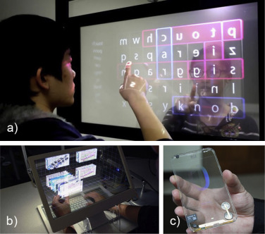 Figure 26. Transparent double-sided screens: the transparent types of electronic components make it possible to produce transparent double-sided screens (Vyas, 2014) (a), (Futuristicnews) (b), and (Scott, 2013 ) (c). |