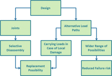 Consequently, the chance of replacing damaged elements increases given that the probability of alternative load paths being simultaneously destroyed is reduced. If joints offer the possibility of selective disassembly, aged or damaged structural elements can be replaced (Ishikawa et al., 2005 and Luo et al., 2010 ). For instance, if a facet is completely removed in facetted shells with three-way vertices, the shell structure stills remain effective (Bagger, 2010 and Bagger et al., 2008 ). Under these conditions, the selective disassembly capability makes it possible to replace a damaged facet safely.