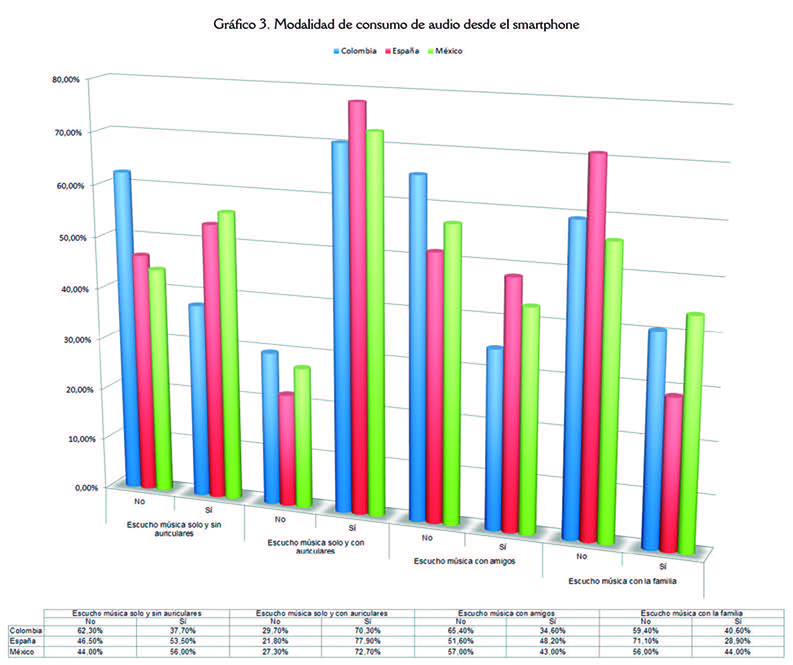 No obstante, se aprecian diferencias significativas que conviene resaltar. Por ejemplo, el consumo de música en los adolescentes colombianos no es tan intenso como en sus coetáneos de España y México; el porcentaje de los que la escuchan a diario es del 52% (la me-dia es del 65’8%), le-jos del 68% de los españoles y del 78% de los mexicanos (se señaló más arriba que México es el país con mayor penetración del streaming de música en el mundo). En sentido contrario, hay un 15% de jóvenes colombianos que admiten que la música no forma parte de su dieta de audio desde el móvil, cifra que contrasta con el 7% de españoles y con el 1% de mexicanos.