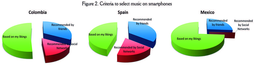 Finally, it is worth mentioning the role influencers play when teenagers choose music on their smartphones: as seen in Figure 2, the influence of friends and social networks is greater among Spanish and Colombian teenagers; whereas in Mexico only 14% admit to take into account their friends’ recommendation and none of them take into account social networks. Data analysis reveals a new scenario of competition between social media and music platforms. This scenario isolates radio programs: radio is no longer the center of music consumption; instead, Spotify has become the place where youngsters find and discover most of the audio content they consume.