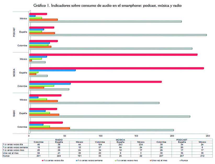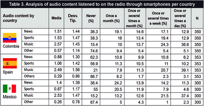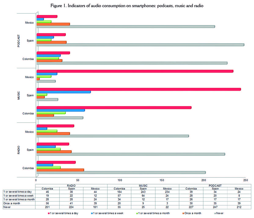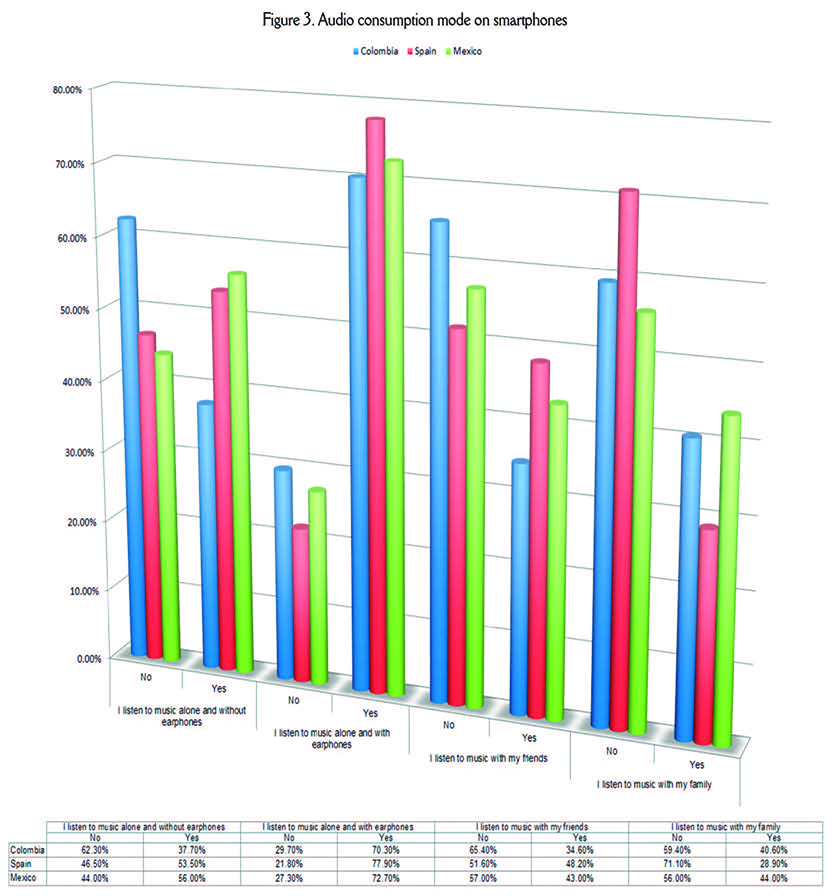 The objectives of this research into the use of smartphones as receivers of audio consumption among teenagers aged 13 to 19 years in Colombia, Spain and Mexico focus on two areas of work:They seek to provide empirical evidence in a new and emerging field of study where few studies have been carried out –the perception and acceptance by young people of an increasingly broad and diverse digital sound offer, which is of enormous economic importance to the communication industries associated with it: radio, music, podcasts and audiobooks. Firstly, a descriptive assessment was carried out on the habits profiled among the subjects of the study, which were considered collectively, and, secondly, the paper assessed whether there is any significant difference between the samples taken from different international contexts.