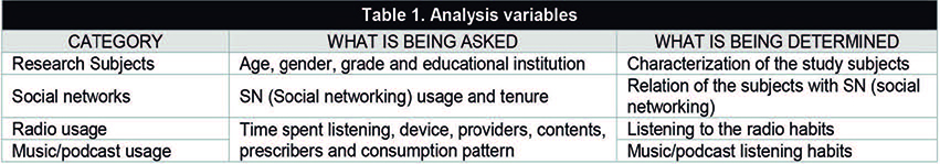 The evaluation instrument was built «ad hoc» and its final design was the result of two processes: a) a previous explorative study with 600 students -the study served as groundwork to define the final study variables– and b) a validation of the instrument in the three countries with a 100-student sample for each case –Mexico (Cronbach’s ? .78), Spain (Cronbach’s ? .81), Colombia (Cronbach’s ? .79)–, allowing to confirm the reliability of the instrument in different contexts. This psychometric validation proved both, the consistency of the tool, and the studied indicators, which were specified in four independent predictive variables (age, gender, grade, educational institution/city) and a total of 38 variables grouped in four constructs of study: social networks, radio, music and podcast (Table 1).