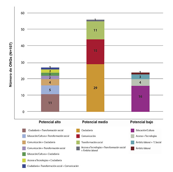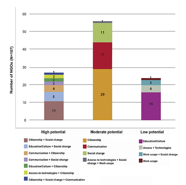 Para analizar los factores relacionados con el empoderamiento de la ciudadanía, se procedió a la catalogación de las propuestas de las 107 ONGs, clasificándolas en cuatro grandes grupos, según sus objetivos: 1) Democratizar el acceso a alguno de estos aspectos: comunicación, educación, cultura, y tecnologías; 2) Trabajar por el cambio social, la transformación de la sociedad, y la inclusión social; 3) Realizar la inserción socio-económica de los destinatarios; y iv) garantizar y luchar por los derechos humanos, la ciudadanía, y los derechos de poblaciones en riesgo de exclusión social.