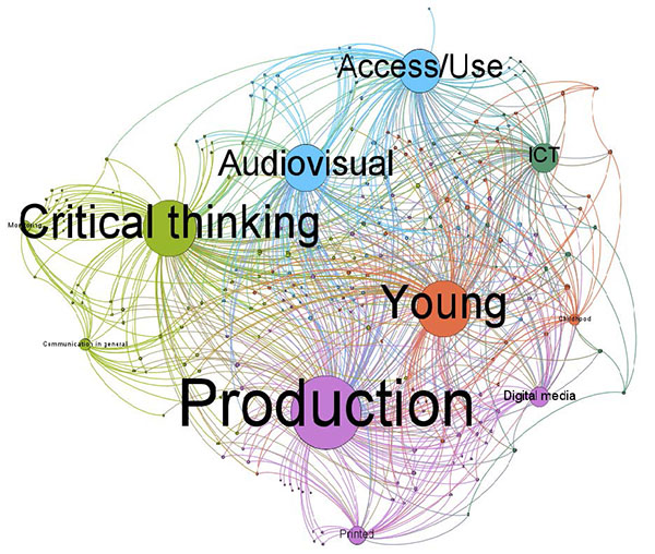 Figure 1 shows the synthetic and uniform distribution (Bastian, Heymann, & Jacomy, 2009) of the main interrelations between the non-formal media education projects analyzed in this project: the dimensions of media literacy, the recipients, and the different media used. The proximity between production activities aimed at young people and the connection between critical comprehension and audiovisual are clearly observable, as is the relationship between the dimension of access and use and the media associated with ICT. On the other hand, it was detected that digital media has not reached the impact one would imagine.