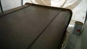 The mold surface is stabilized at high temperature and undergoes a vacuum integrity test. A release agent is applied on the stabilized mold surface. This is then typically followed by a thick layer of gelcoat, which is intended to provide a uniform finish with a desired color. Liquid resin is then applied and on top of it the first layer of reinforcing fabric is placed. Rollers are used to apply pressure over the fibers to infuse and deaerate the layer. These steps are repeated, applying layers of fabric and resin until the desired thickness is reached and ensuring that the layers fit perfectly to the complex shape of the mold. Vinylester is used as a type of mat and is placed between each thin layer of fabric in order to absorb the resin and obtain the thickness. An evolution in the structural design and resin matrices has allowed for a reduction in the use of the mat and a substantial increase in direct fiber proportion in the laminate. This reduces the number of layers necessary to obtain the determined strength and resistance.
