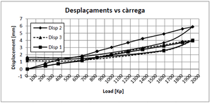 The prototype is supported over two simple wood supports with a 2 m free span (L). Load is applied in the span center by using sand bags. Load is progressively increased in 200 kp steps from 0 kp to 1926 kp. Maximum measured deformation at midspan was 6mm. It is below its maximum admissible value, L/205.