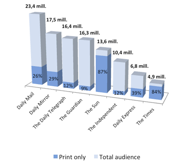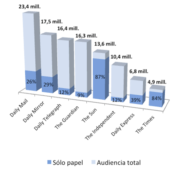 Estos soportes, lejos de ser un simple complemento para la audiencia de los diarios en sus formatos tradicionales, constituyen en algunos casos la principal fuente de afluencia de lectores. El caso del Reino Unido constituye un claro ejemplo de ello. Según los datos más recientes del exhaustivo National Readership Survey (2014)1, el 62,6% de los lectores de las ocho principales cabeceras de la prensa británica accede a las informaciones de los diarios desde ordenadores personales y dispositivos móviles. Resulta particularmente significativo el caso de «The Guardian», de cuya audiencia total sólo el 9% lee exclusivamente la edición en papel, unas cifras similares a las que también muestran «The Daily Telegraph» o «The Independent». En el otro extremo se mantienen aún «The Sun» y «The Times», cuya apuesta por muros de pago muy rígidos en Internet y los dispositivos móviles provocan que cuatro de cada cinco de sus lectores lean únicamente sus ediciones impresas.
