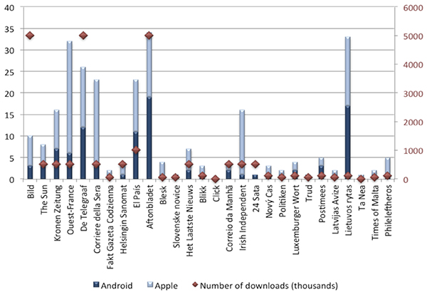 Esta nueva fuente de afluencia de lectores ha promovido la apuesta en favor de las aplicaciones para los dispositivos móviles. Salvo el diario político griego «Ta Nea» y el tabloide rumano «Click», todos los diarios líderes europeos han desarrollado al menos una aplicación específica. Por tipología, además de las obvias adaptaciones de los contenidos informativos de las ediciones web, la oferta complementaria para los dispositivos móviles incluye aplicaciones especializadas por secciones temáticas (deportes, etc.), coberturas especiales de eventos o fechas señaladas, o contenidos de tipo comercial.