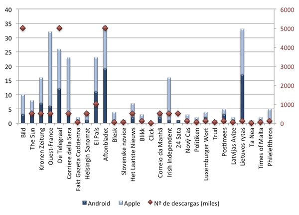 Figura 3. Nº de aplicaciones móviles desarrolladas por los diarios europeos.