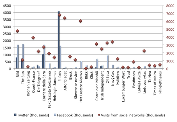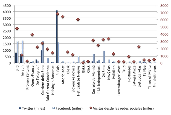 También las redes sociales –en particular Facebook y Twitter– se han constituido como importantes fuentes de acceso a las informaciones de los diarios y, en el caso de los diarios líderes europeos, el 19,5% de las visitas proviene de ellas. Su creciente influencia explica el aumento en el interés de los medios por crear comunidades virtuales alrededor de sus cabeceras, y repercute también en el refuerzo de la unidad informativa como núcleo de consumo de los medios de comunicación en los soportes digitales. Su uso como herramientas de promoción de contenidos, fundamentalmente en el caso de Facebook, y con un mayor perfil conversacional en el caso de Twitter, es altamente valorado por los medios (Noguera, 2010; García-de-Torres & al., 2011).