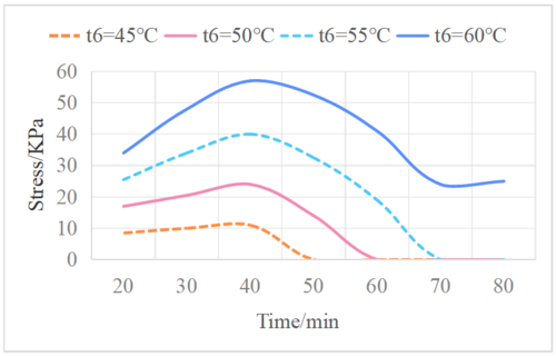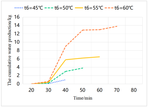 Figure 7 illustrates that the working cycle time of the system and the degree of pressure increase both decrease as the temperature of the hot sea water decreases. This is because the reaction with non-condensing gas is faster at lower water temperatures. Due to the lower temperature, less sea water evaporates, and although the emission of non-condensing gas is also small, its proportion of the vapor is large, thus shortening the operation time [11]. Figure 8 shows the cumulative water production of the system corresponding to different water temperatures. The cumulative water production of the system increases with the increase of water temperature. Under the condition of water temperature of 60°C, the system has a working cycle of 75 minutes, and a cumulative water production of 13.77 kg, which means it produces 10.98 kg of fresh water per hour.